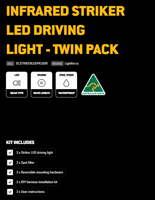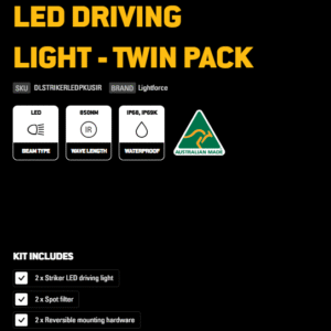 Striker IR LEDs are the latest infrared driving lights from Lightforce. Their rectangular shape gives them a rugged look on any 4X4 or SUV, and that’s the only thing even slightly square about them. They’re designed to perform to our impossibly high standards, and their IP68 and IP69K ingress protection rating means they can handle a roaring creek crossing and even a high-pressure wash after a little adventure in the mud and dust or while serving a warrant. Reduced radio interference technology allows you to operate communication equipment such as ham radios, CB and FRS radios static-free. And a range of rectangular modular filters lets you modify the lights to suit any conditions. A pair of protective clear spot filters is included.