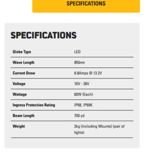 Operating at 850nM, they perform well with all types and generations of night vision and remain our most premium IR product offering. A complete wiring harness is also included for easy installation.