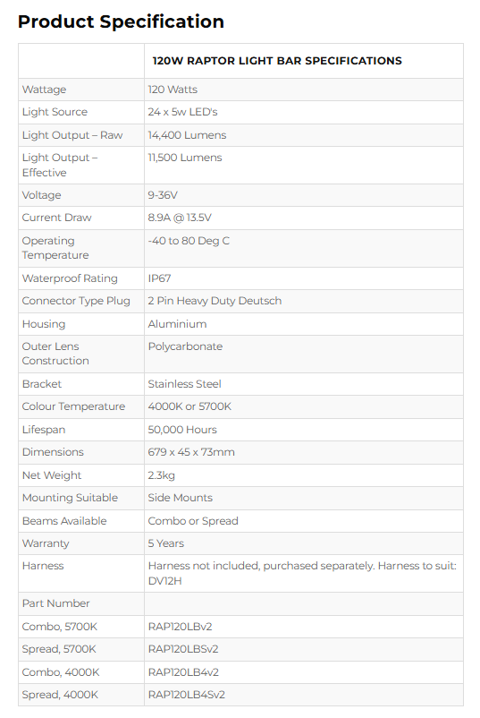 All RAPTOR lamps come complete stainless steel pivot mounting brackets and stainless steel fixings. As with all Raptor products, the light bars are manufactured in Australia and covered by a 5-year warranty for total peace of mind.