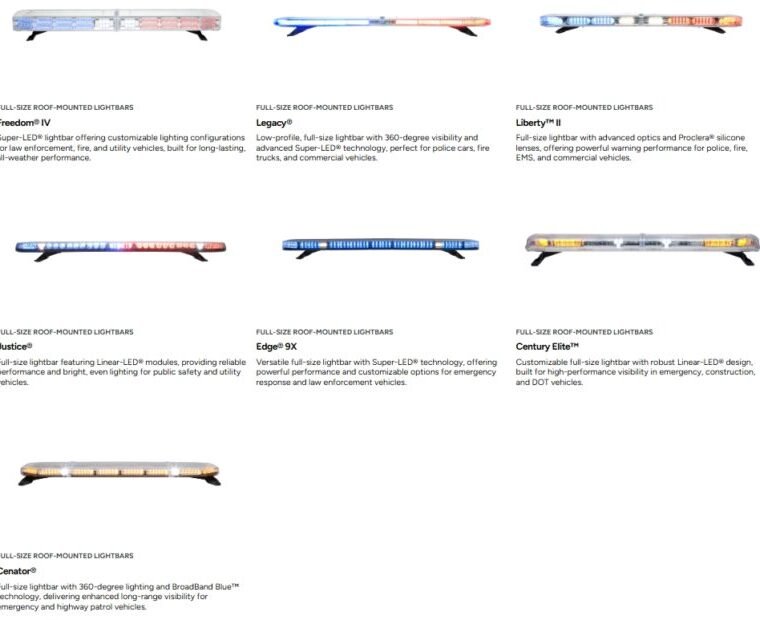 Low-profile, full-size lightbar with 360-degree visibility and advanced Super-LED® technology, perfect for police cars, fire trucks, and commercial vehicles.