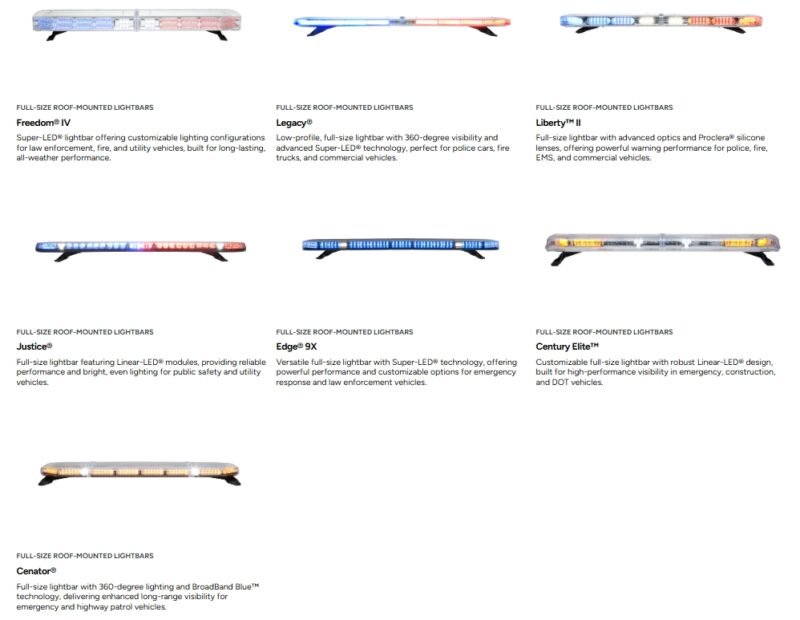 Full-size lightbar with advanced optics and Proclera® silicone lenses, offering powerful warning performance for police, fire, EMS, and commercial vehicles.