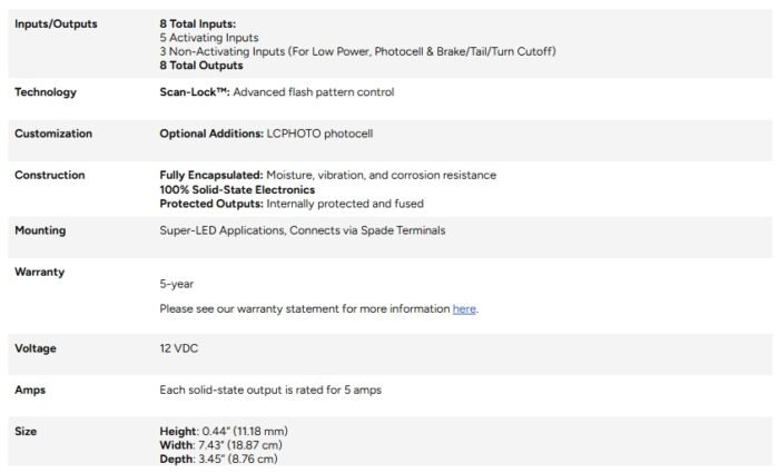 The SLFLASH SmartLogic™ programmable flasher is engineered for optimal situational awareness, delivering highly effective visual warning for emergency and service vehicles. This system features eight outputs, all of which are internally protected and fused to ensure reliability. With a range of advanced technologies, SLFLASH offers customizable flash patterns and day/night mode setups to adapt to different operational needs. Designed for durability, SLFLASH is fully encapsulated to protect against moisture, vibration, and corrosion, making it suitable for tough environments. The system is USB-configurable, allowing operators to easily adjust settings, and onboard diagnostic indicators provide real-time feedback on active outputs and blown fuses. Whether for law enforcement, utility vehicles, or emergency response, SLFLASH provides dependable and efficient visual warning in any situation.